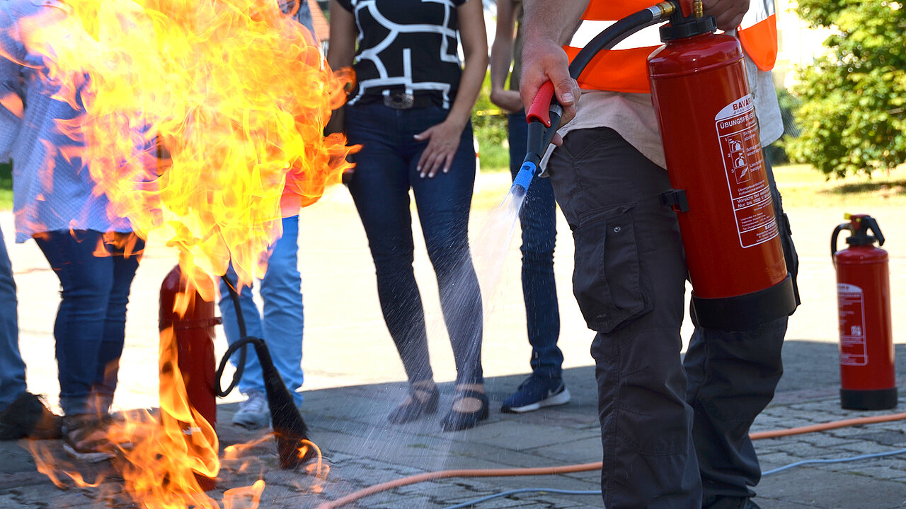 Zum Ausbildungsinhalt gehören auch praktische Übungen im Umgang mit Feuerlöscheinrichtungen.